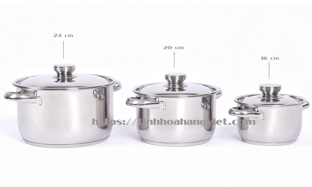 Bộ nồi gồm 3 nồi với đường kính 16, 20, 24 cm phù hợp với mọi nhu cầu nấu nướng của gia đình 3 – 4 người.