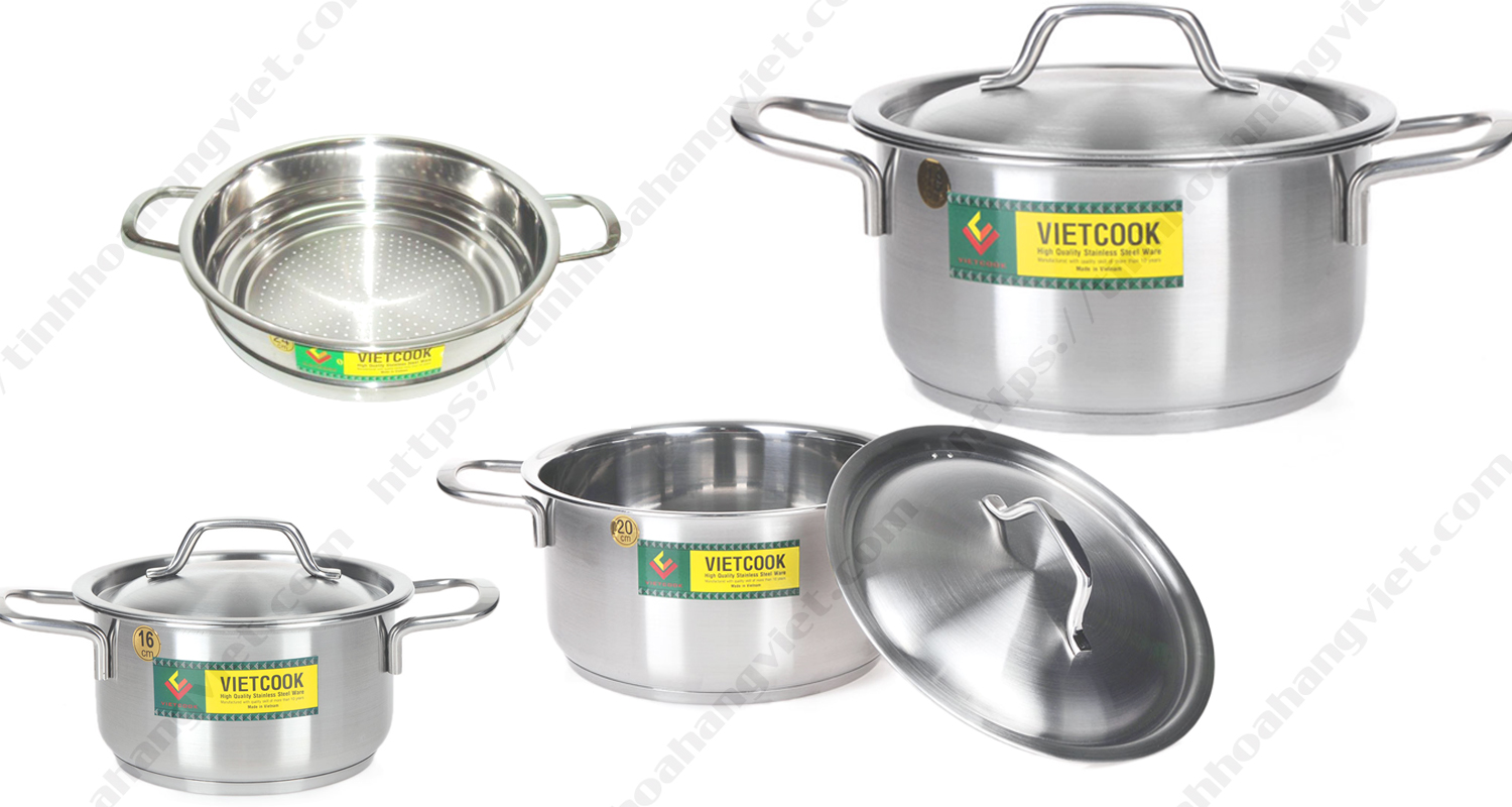 Bộ nồi inox VIETCOOK với đặc điểm nổi bật về kiểu dáng, tính năng tiện dụng, an toàn cho sức khỏe. Bộ nồi inox nắp inox VIETCOOK V04 là sản phẩm không thể thiếu trong mỗi căn bếp Việt. Bộ nồi V04 được làm từ chất liệu inox SUS 430 cao cấp với kiểu dáng tinh tế, nắp inox cao cấp luôn sáng bóng, nhẹ nhàng an toàn khi sử dụng, quai nồi làm bằng inox đũa đặc sang trọng, chắc chắn, bền đẹp. Dễ dàng vệ sinh sạch sẽ sau khi sử dụng. Bộ sản phẩm gồm 03 nồi với kích thước Ø 16, 20, 24cm và 01 ngăn xửng Ø 24cm đáp ứng được tối đa nhu cầu nấu nướng cho gia đình bạn.
